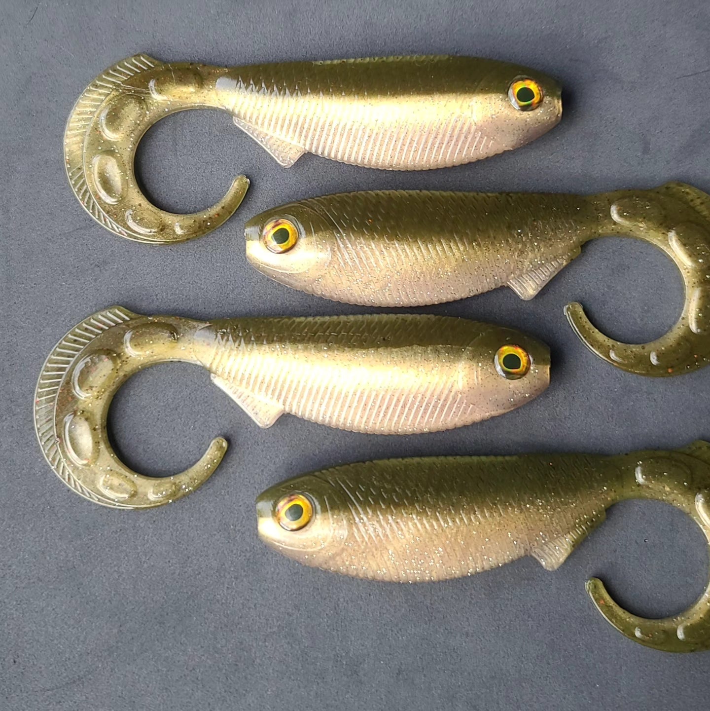 7.6" total length swimbait. Length of bait as pictured is just under 6". Recommend rigging with a 10/0 weighted twist-lock style beast hook (not included). Bait weighs 1.2 oz. Eyes included.